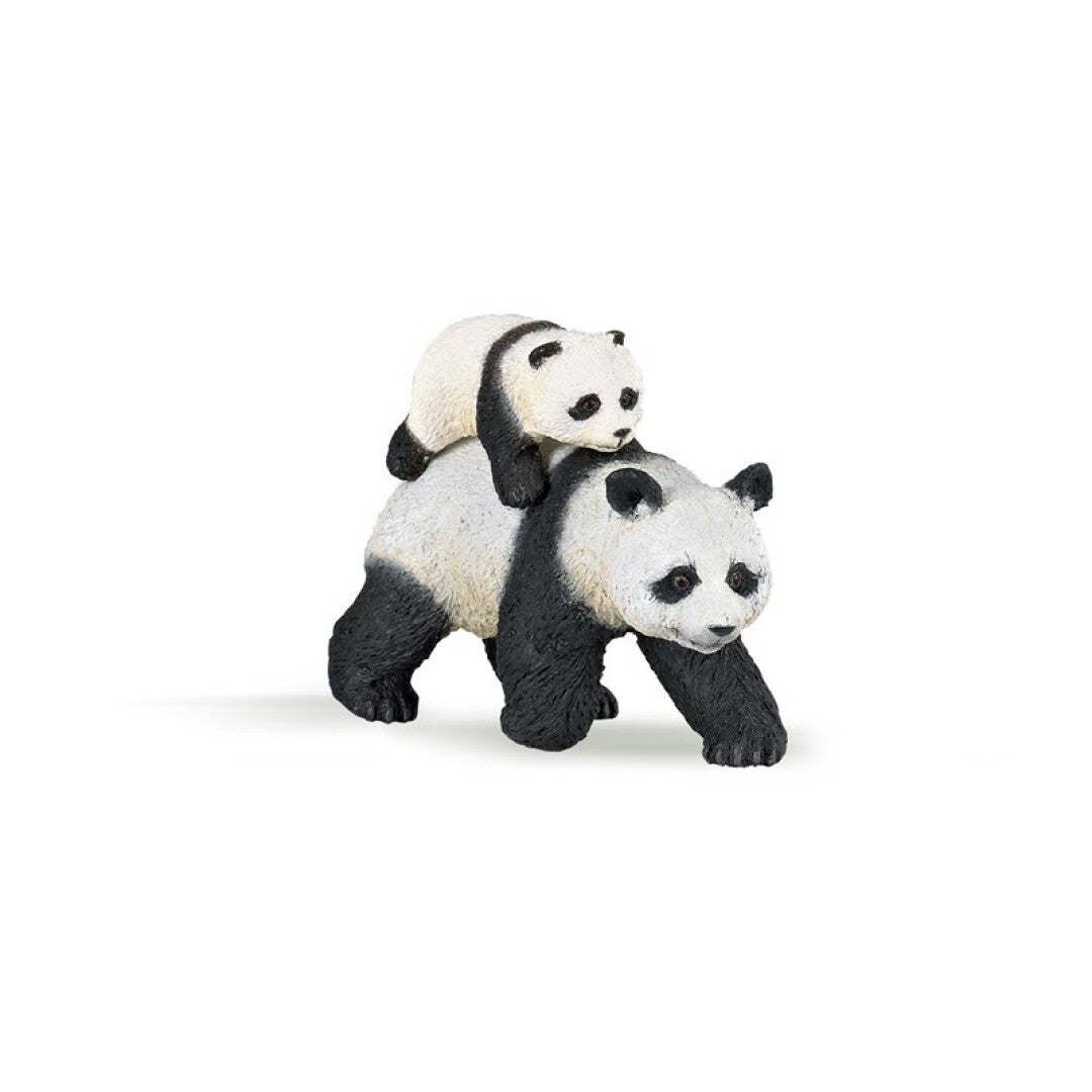 Mamá Panda sigue tan adorable como siempre con su espeso pelaje y sus ojos bordeados de negro. Llena de inocencia, su bebé está firmemente pegado a su espalda, posición que no abandonará hasta los 6 meses de edad. El panda gigante es un mamífero que vive en el centro de China. Este herbívoro bastante pacífico se alimenta de plantas, principalmente bambú, que come en grandes cantidades. Tiene un sexto dedo que le permite agarrar los tallos con toda la mano. El panda gigante es una especie que actualmente se considera en peligro de extinción.