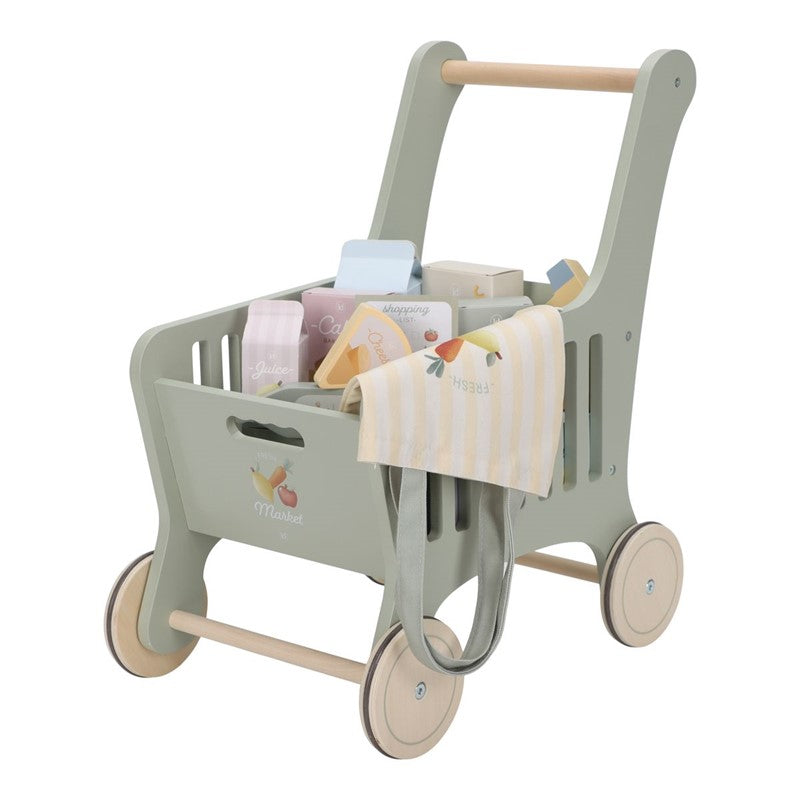 ¡Comprar se convierte en una aventura! Con este carrito de compras de madera para jugar, puedes conseguir todo lo que necesitas. Gracias a su amplio espacio de almacenamiento, caben todos tus comestibles, incluso si tu lista es larga. El clip de madera mantiene tu lista de la compra segura en su lugar, para que no olvides nada. El set incluye varios artículos de supermercado y una bolsa de la compra, para que puedas empezar a jugar de inmediato. El carrito está decorado con una divertida ilustración en la parte delantera, lo que hace que jugar sea aún más divertido. ¿Quieres la experiencia de compra definitiva? ¡Combina el carrito con el puesto del mercado y disfruta de una diversión sin fin!
