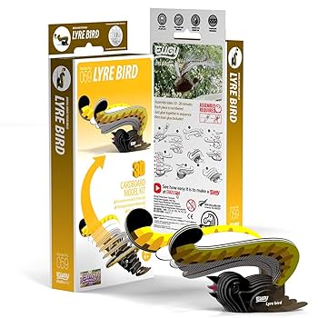 Kit de manualidades 3D EUGY 059 Lyre Bird: construye paso a paso una figura de cartón reciclado con adhesivo no tóxico y tintas ecológicas. Un proyecto creativo y sostenible para peques a partir de 6 años que fomenta la motricidad fina, la concentración y el amor por la naturaleza. Incluye piezas numeradas y guía de montaje. Tiempo de montaje: 20–45 minutos aprox.