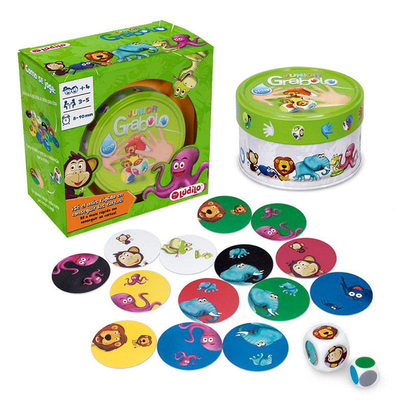 Con Grabolo Junior tienes que demostrar que tienes los mejores ojos y las manos más rápidas en la mesa. Los dados indican la combinación de color y animal que debes buscar. Intenta ser el primero en coger la carta correspondiente.