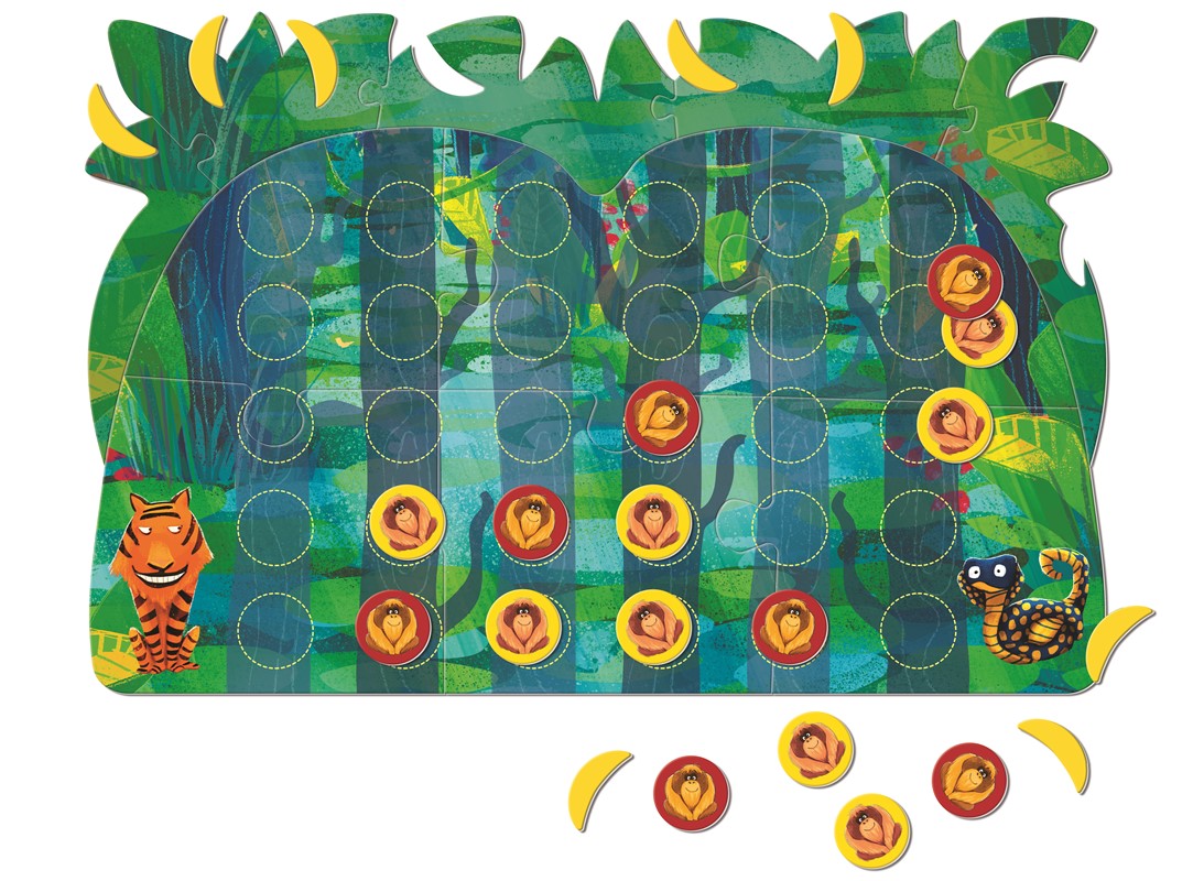¡Un clásico atemporal reiniventado de una manera sencilla y divertida! Una jungla, dos orangutanes y plátanos para recolectar. El objetivo es formar filas de 4 fichas en horizontal, vertical o diagonal. Por cada 4 en ray se obtiene uyn plátano, y gana el primero en conseguir 4 plátanos.