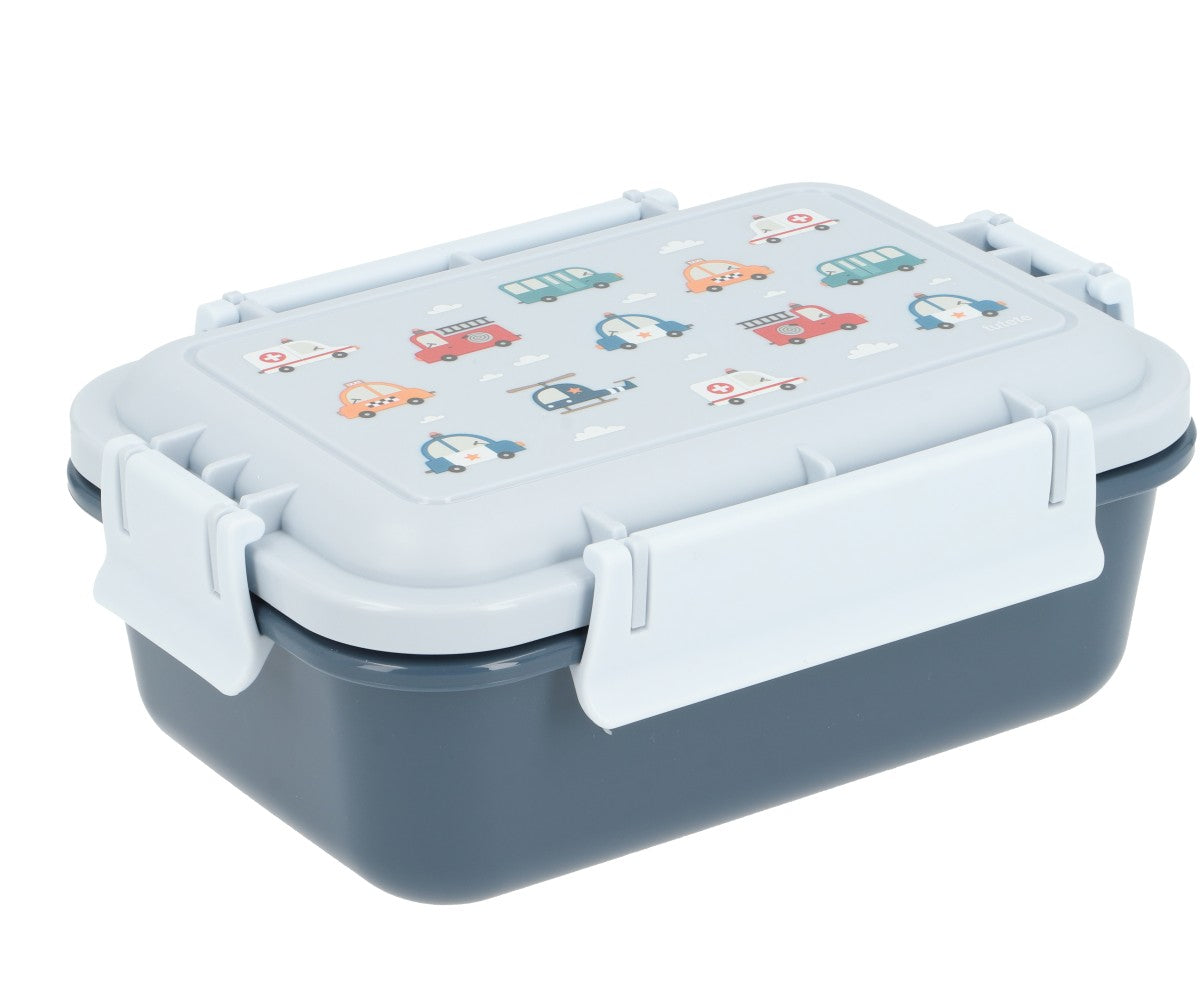 Caja bento con compartimentos para niños. Diseño City Cars, ideal para llevar variedad de alimentos.