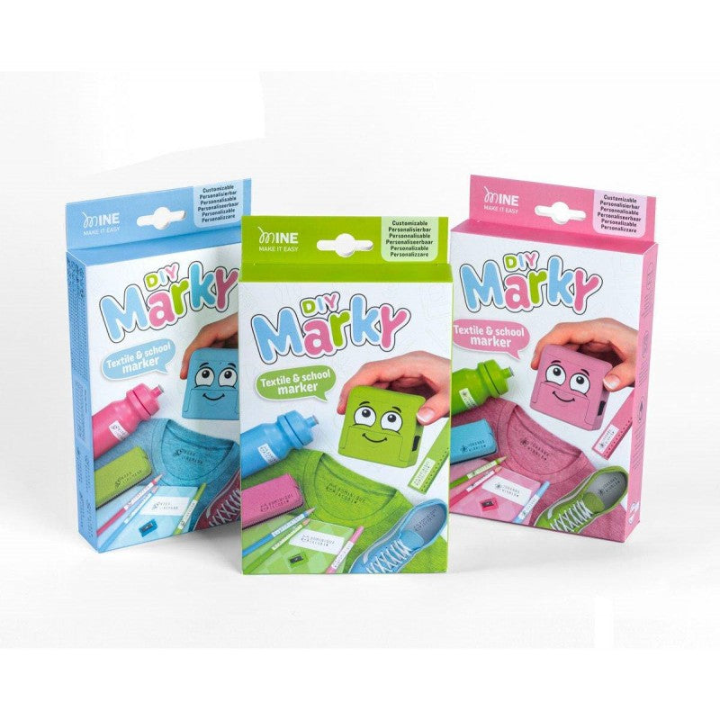 MARKY es un práctico sello para marcar la ropa pensado para los niños que se puede escoger en 3 colores: rosa, azul o verde. La tinta negra especial para textiles, que también ha sido dermatológicamente probada, puede utilizarse para marcar no sólo textiles, sino también papel, cartón y muchas otras superficies absorbentes.