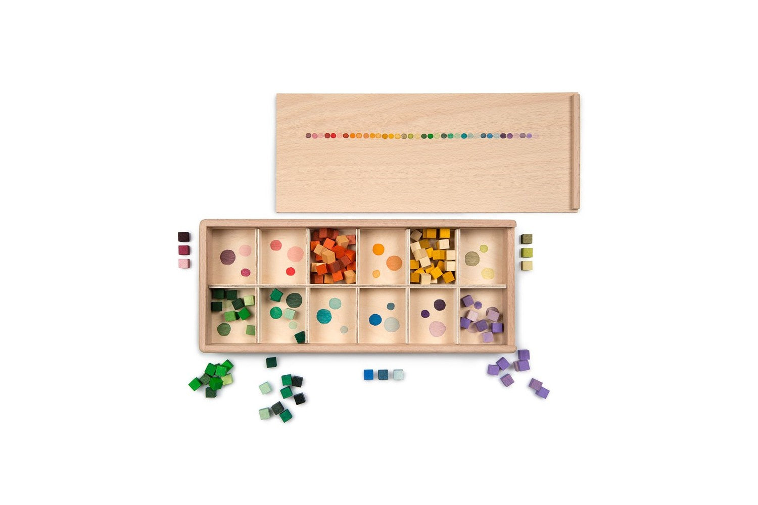 Mis and Match es una colección de cubos de colores en una caja clasificadora de madera. Los cubos son multifuncionales. No importa si se usan para jugar libremente o para crear mosaicos, al usarlos los niños experimentarán conceptos matemáticos y geométricos explorándolos con sus manos. Más de 400 cubos pequeños de madera en 36 colores degradados del arcoíris. Incluye una caja clasificadora de madera pintada a mano.
