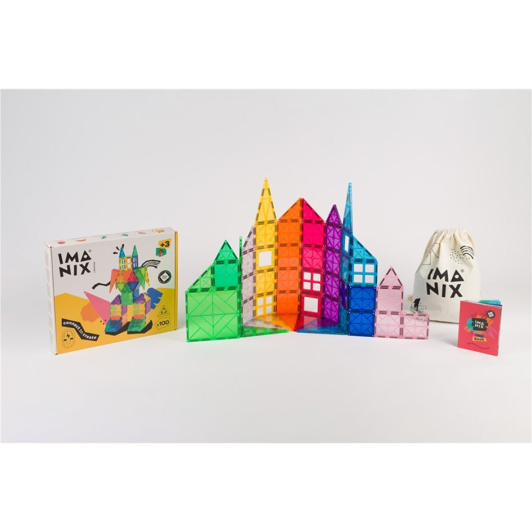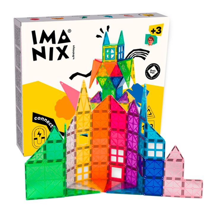 Juego de construcción magnético Imanix con 100 piezas translúcidas de colores, de Braintoys.