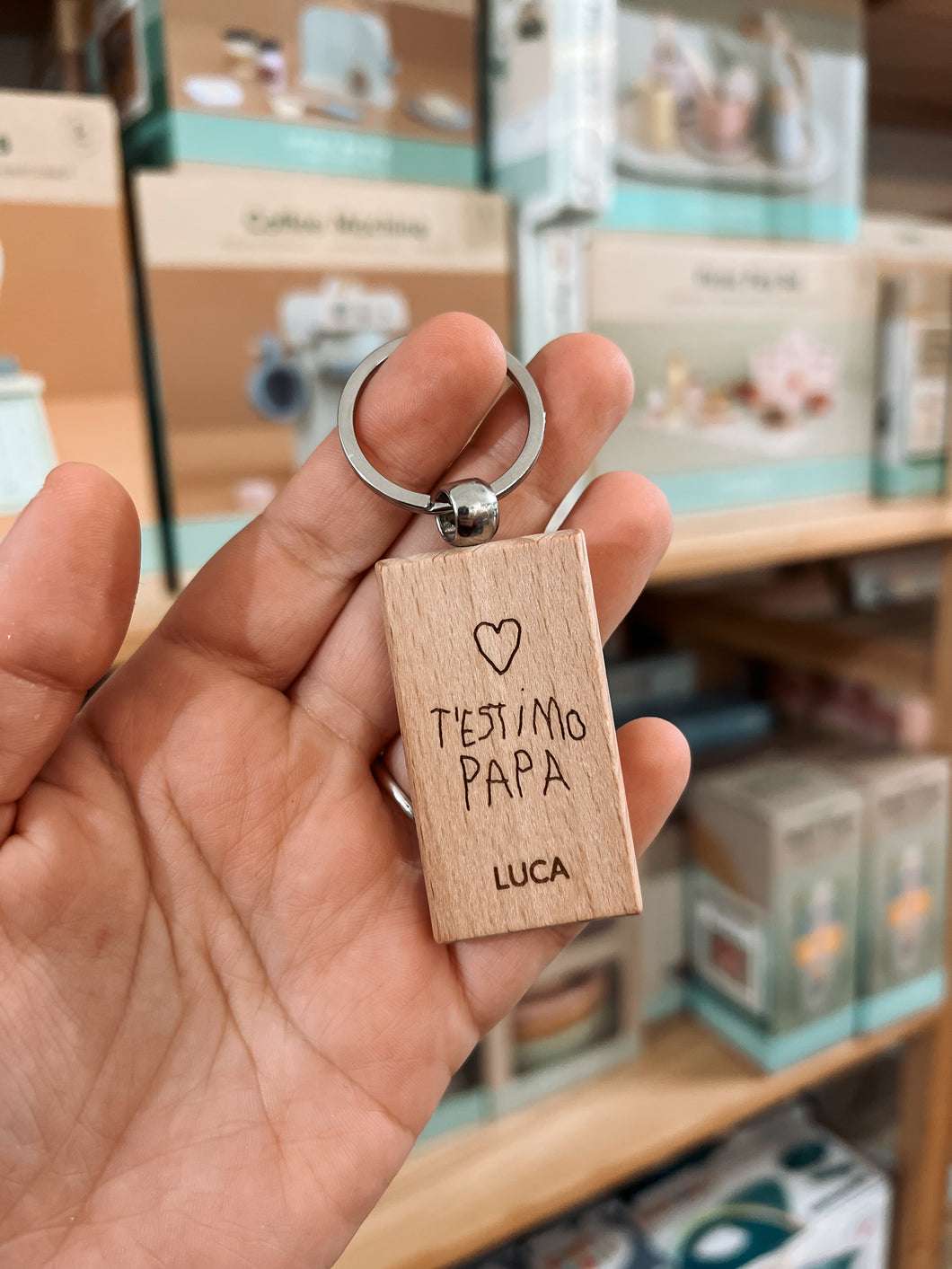 Haz que papá lleve siempre consigo un pedacito de amor con este llavero de madera personalizado. Un detalle especial donde los más pequeños pueden dejar su huella con dibujos, frases o palabras escritas por ellos mismos, grabadas con precisión para un recuerdo único e inolvidable.
