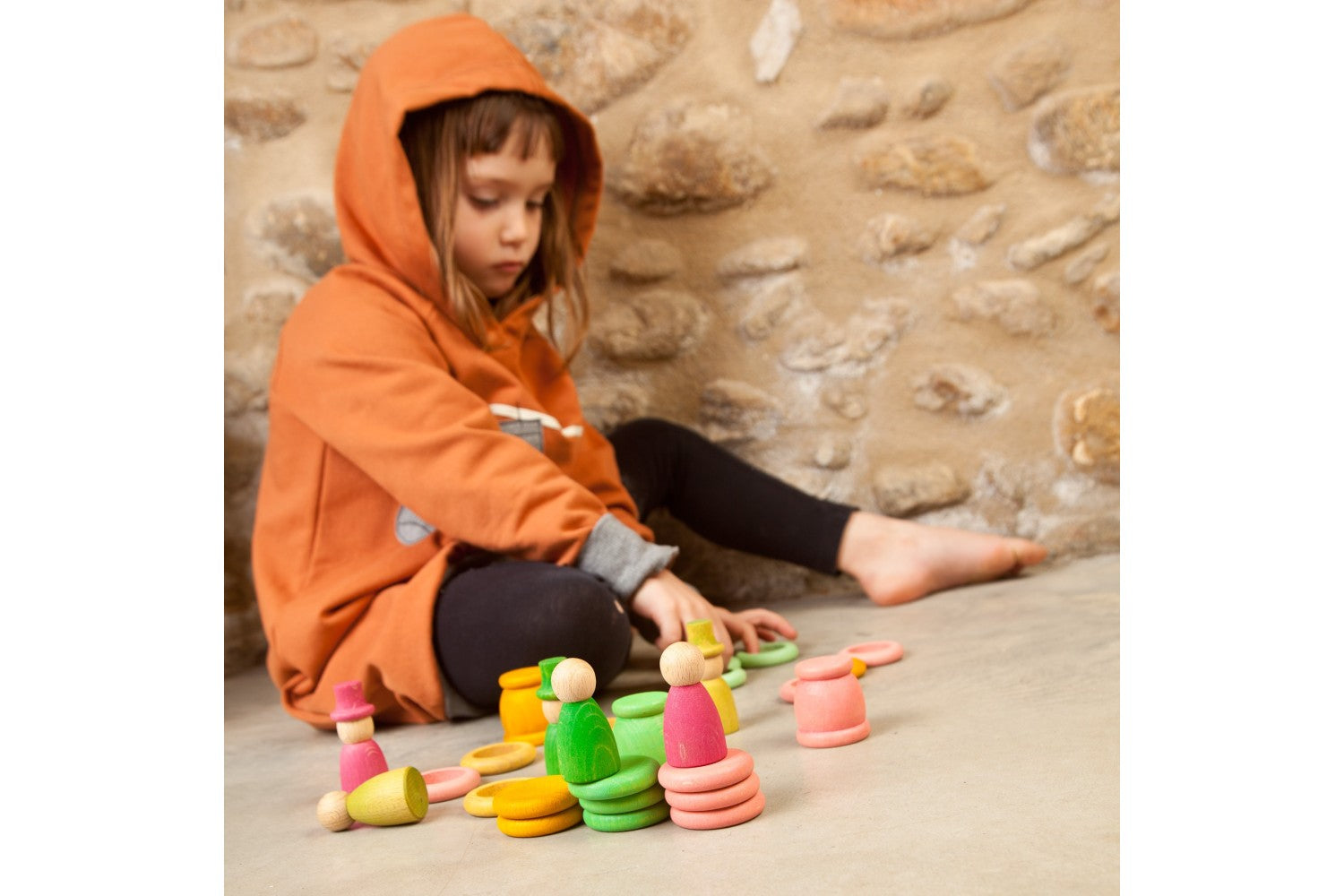 Contiene 12 Nins en 12 colores, 1 bol, dos cubos de madera natural y una plataforma distribuida en 4 secciones que determinan las estaciones, estampadas con los meses del año.