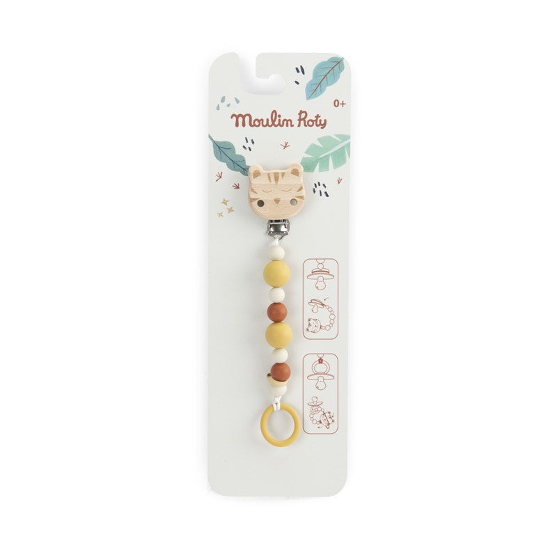 Su clip permite fijarlo fácilmente a la ropa, manteniendo el chupete siempre a mano y evitando que caiga al suelo o se pierda. Las cuentas, agradables al tacto, aportan además un estímulo sensorial suave durante la etapa de exploración oral.