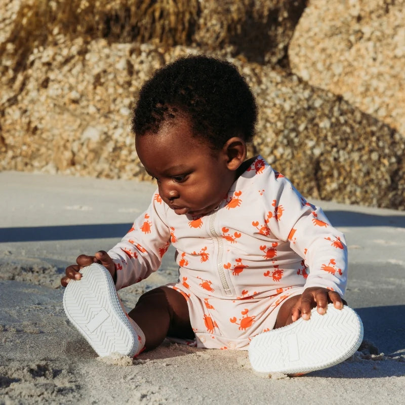 Bañador UV para niñ@s, juguetón y protector, en el alegre estampado Oh Crab, hecho de tela reciclada de secado rápido para una diversión de verano sin preocupaciones al sol.